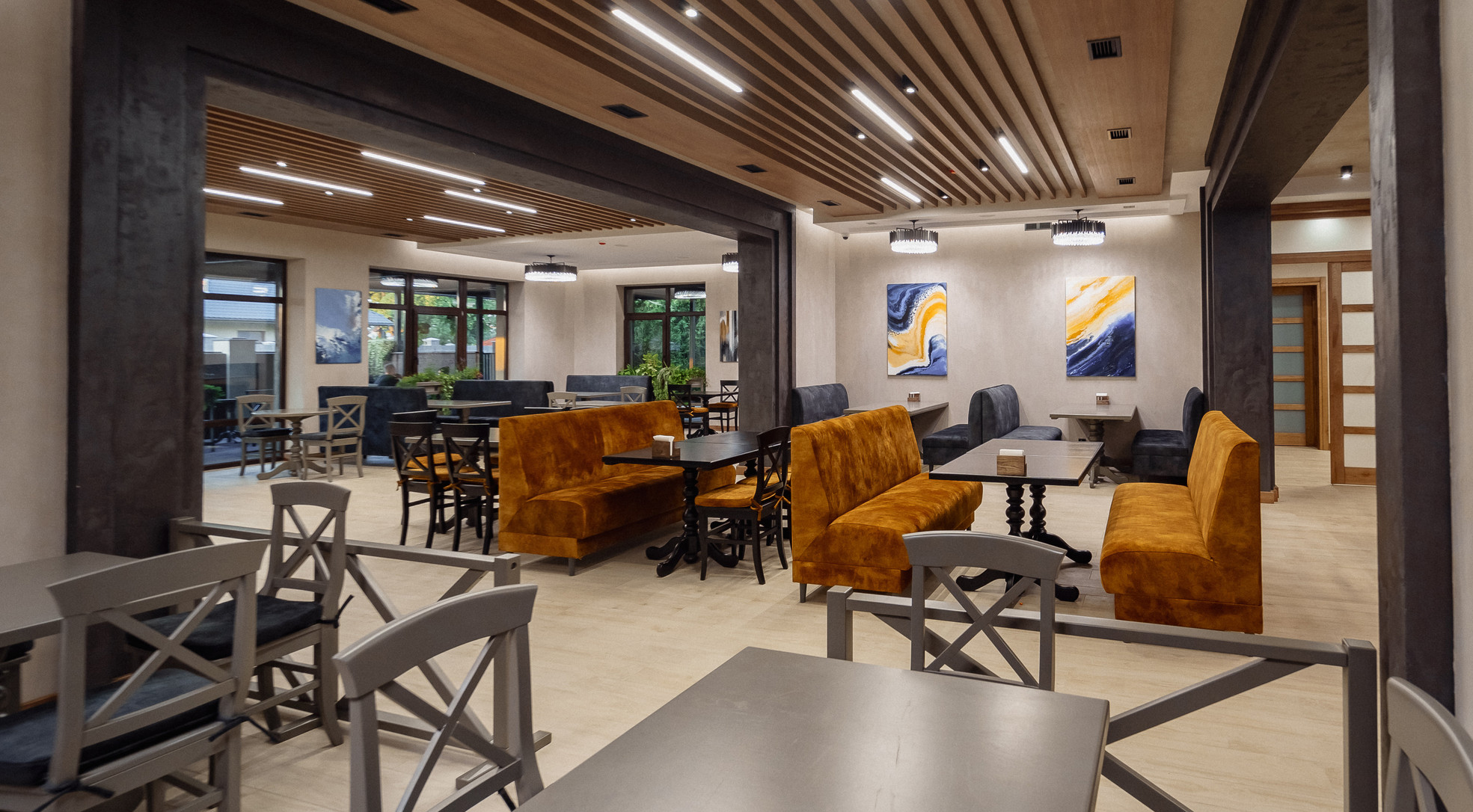 Затишний інтер'єр. Привітливий персонал. Тихе й спокійне місце для відпочинку. Огороджена парковка з охороною.